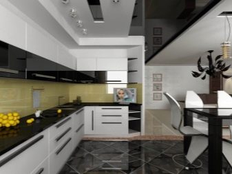 You can see the beauty of the German black glossy stretch ceiling in the kitchen further.