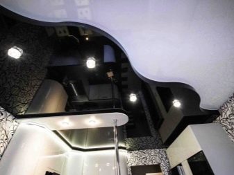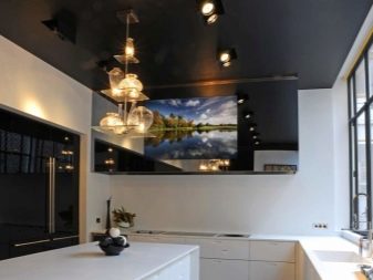 Black canvas on the ceiling means using all possible effects. This is a "starry sky." Moreover, it can be static or reflect certain processes. Do not forget about spotlights, which wonderfully reflect light from a glossy ceiling. A chandelier against a dark background should be bright and massive.