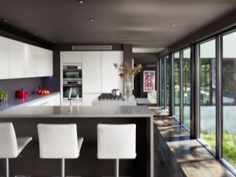 A black ceiling and floor in the kitchen is a great option for emotional natures. The coating in dark colors perfectly sets off the light elements in the room, emphasizing silver and gold appliances.