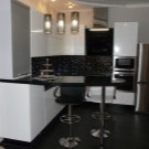 Usually a narrow kitchen becomes a design problem. For convenience, it is also worth trying to bring to the classic rectangle. A good solution would be a corner kitchen set and a corner bar counter located at opposite ends from each other.