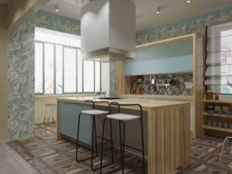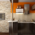 - The material of the bar counter often differs from the texture of the kitchen set itself, which can be advantageously used for zoning. The bar counter is visually separated from the kitchen precisely because of the difference in texture, while the color match allows you to not split up the interior. The panel on the wall with imitation of wood looks very good, which combines all the elements of the kitchen - this can be used to separate the kitchen from the bedroom in the studio apartment.
