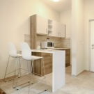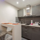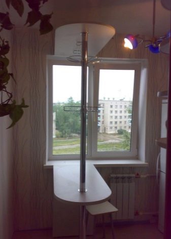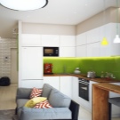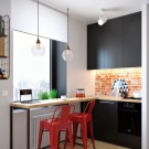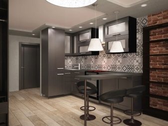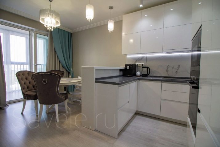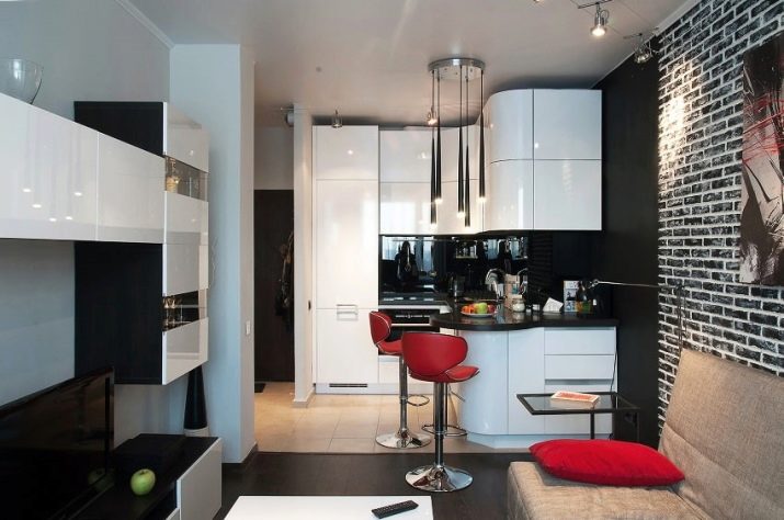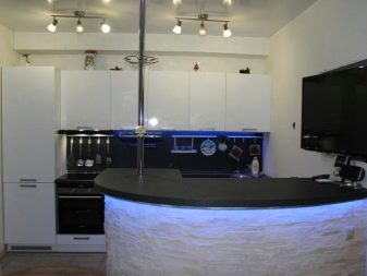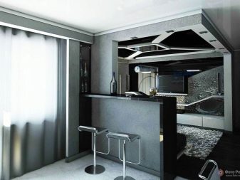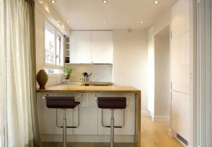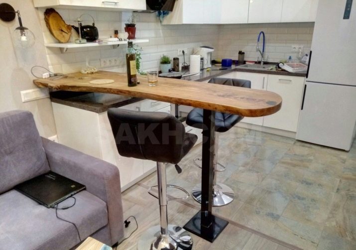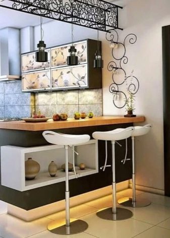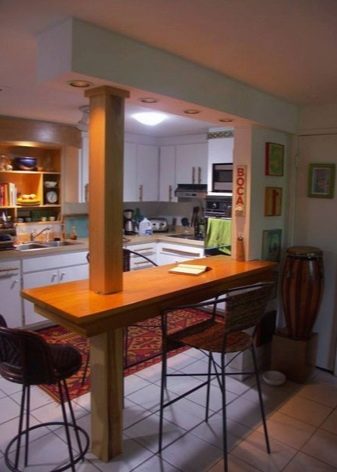 In small studios, the issue of saving space in the kitchen is also very important. The bar counter in this case is very well used for zoning the space, allowing you to separate the kitchen area directly from the living room. The headset can be straight or angular.