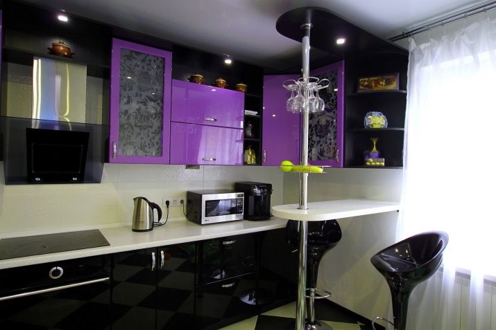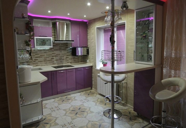 - In this example, the bar counter is completely separate from the headset, but due to the matching colors, it was combined with the kitchen in design. Bright glossy headset makes the room spacious and fills it with light. Due to the complex violet color and its combination with brown and white, even a minimalistic design does not look boring at all.