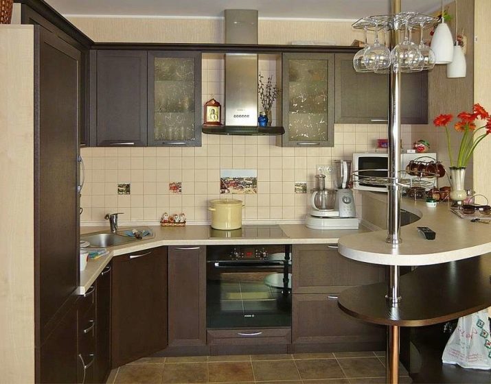 Very often, kitchens with a small footage can be found in Khrushchev, as well as in some modern houses. This can significantly save space for living rooms - for example, to make a more spacious bedroom or living room. A small kitchen can be quite cozy, comfortable and even look visually larger. Very often they choose the atmosphere with a bar instead of a table - this is how space is used as efficiently as possible.