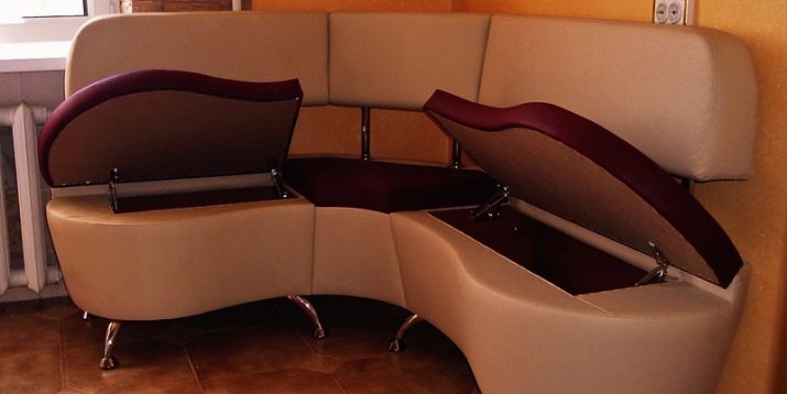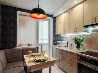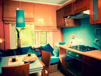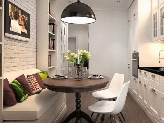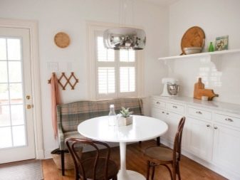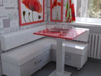 Sofas, as well as kitchen sets, are straight and angular. These two options are good for a small kitchen. However, it is better to give preference to non-massive models. This will save space. Most often, sofas are placed in the corner of the kitchen, but direct models can also be placed against the free wall.