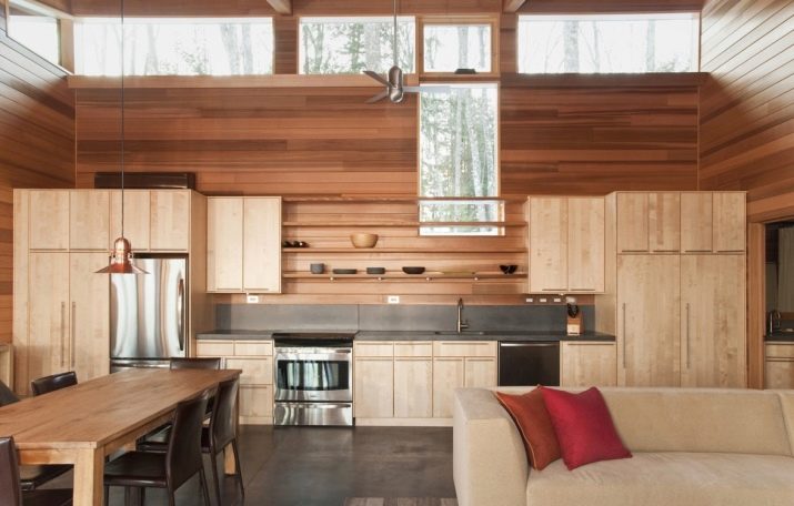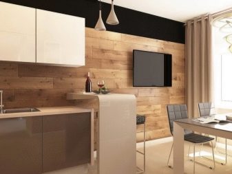 A winning option is to choose a laminate for wall decoration, the color of which will match the flooring, countertops, shelves and hanging cabinets. All of the above items together will create a holistic composition.