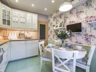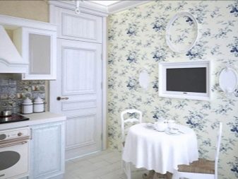 With the help of a small picture on bright wallpaper, the space of a kitchen with a light set will visually increase. It will appear lighter and more spacious. This is a chic design option in rustic and provencal styles, perfect for the direction of shabby chic.