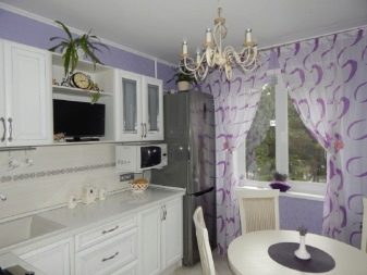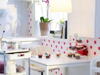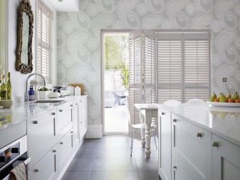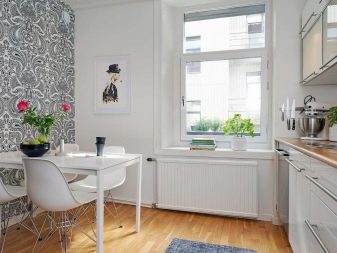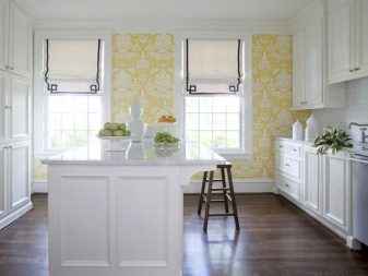 The kitchen, solved in white, looks light and solemn. There seems to be much more space and light. A huge role in this is played by properly selected wallpapers that maintain a pleasant feeling of spaciousness and cleanliness in the interior.