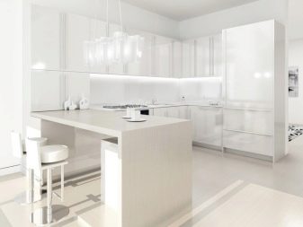 White kitchen sets will perfectly match the wallpaper of any color. Designers believe that the white tone opens up opportunities for the embodiment of even the most daring fantasies and ideas.
