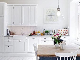 Guests invited to the house, where a white set is displayed in the kitchen, are always delighted. Light furniture characterizes the hostess as neat and hardworking, emphasizes her impeccable taste.