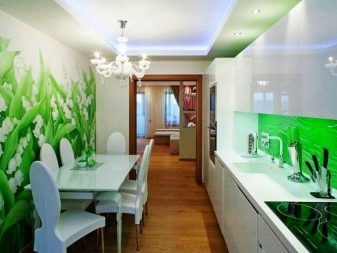 Images of delicious juicy fruits, compositions with utensils are popular. Anything that matches the design intent and emphasizes the dignity of white furniture is welcome. The main thing to remember is that a large drawing significantly reduces space.