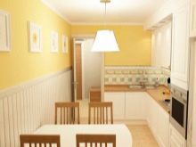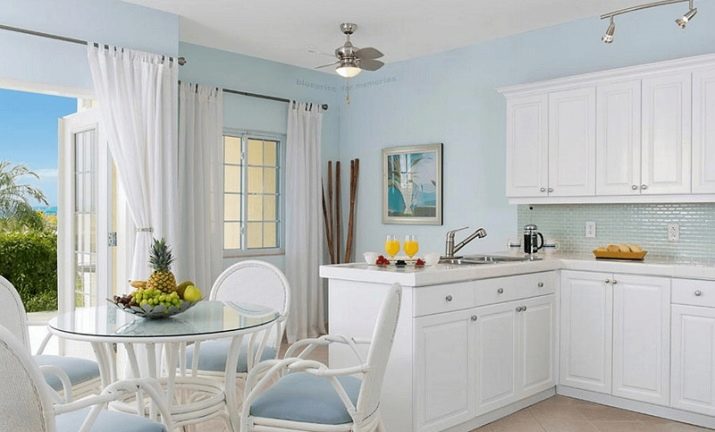White color will give the kitchenette airiness. So that the room does not resemble a hospital ward, it is better to dilute the monophonic covering with bright accents.