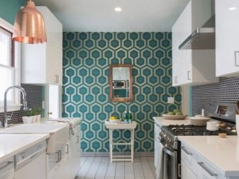 For a small kitchen, it is better to choose a wallpaper, thanks to which you can visually increase the space.