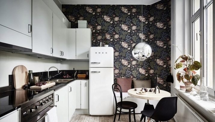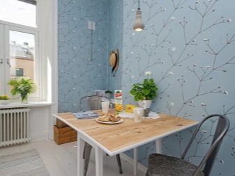Wallpaper for a small kitchen is better to choose moisture resistant. If spots and other contaminants appear, you can get rid of them with a normal damp sponge and detergent. Such a moisture-resistant coating can be an excellent alternative to a kitchen apron, although its service life will be less than when using ceramic tiles or plastic panels for these purposes.