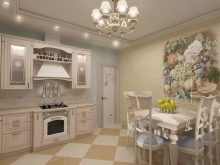 - Country and Provence involve the use of natural, natural shades and prints. Muted light green, all tones of brown and pastel shades are perfect. A beige wall with a small floral print is a common option.