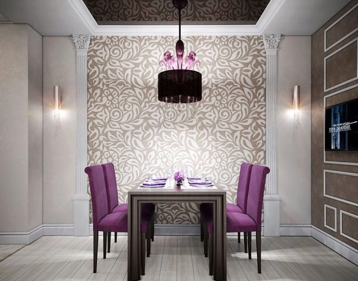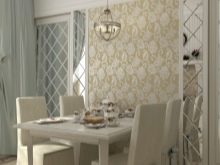 - Wallpaper. Quite a common choice for apartments. Choose the best washable or liquid options. You can decorate only the area near the table with your wallpaper and make the frame a plaster molding or baguette. On the sides you can put narrow cabinets or racks, which also helps to delimit the space.