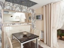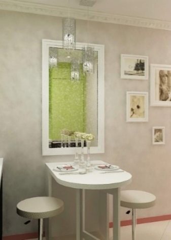 - Mirrors Size depends on your preference. If you eat food and reflect in the mirror on the entire wall is not very comfortable, you can arrange a small or figured mirror. Some beliefs say that it is impossible to eat in front of a mirror, however, the teaching of Feng Shui does not prohibit the use of such a decor. Reflection makes the kitchen visually larger and lighter. You can decorate the wall with mirror murals or mosaics.
