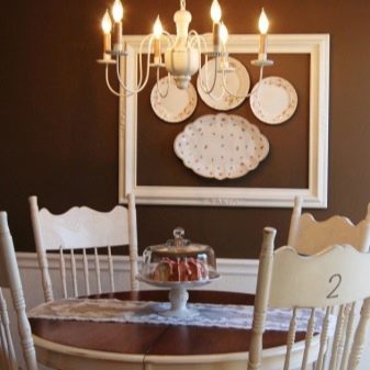 - Decorative plates. Well suited for retro and country style interiors. Elements of gastronomic themes emphasize the purpose of the zone. Above the table, such decor is more than relevant. Colors should be selected based on the overall gamut of the room. If the kitchen is bright, then the plates should be concise and vice versa.