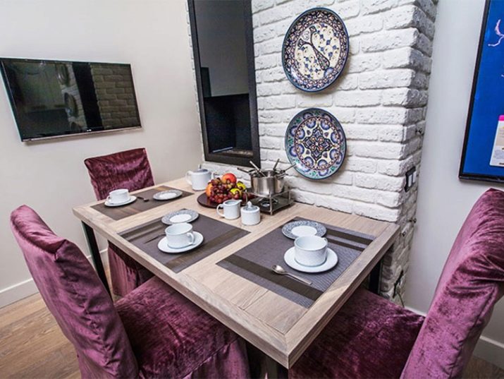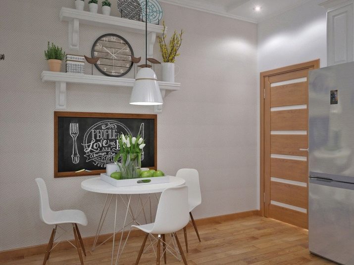 The dining area can be placed away from the work area so that it does not get dirty. This part of the kitchen can be distinguished, made accented.