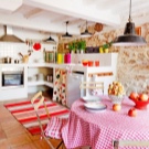 - The abundance of textiles. Homemade rugs, patchwork or knitted, look ideal in a rural kitchen. The emphasis is also on curtains, tablecloths, pillows for a bench or kitchen sofa, towels.