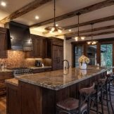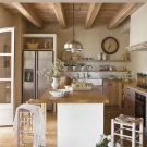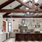 Usually the ceiling in a rustic interior is light. It is painted with paint, often the same as the wall. But its distinctive feature will be beams. Some people think that dark beams on a light ceiling background convincingly look only in a large rural house. But even in a small kitchen in a high-rise building, this element can successfully fit into the overall plan.