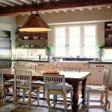 A dining group is also preferred of natural wood. Metal forged legs are possible, but not chrome plated. The glass table top will definitely not fit into the interior, the massive wooden one will be authentic. Yes, rustic furniture welcomes furniture that looks bulky, durable, made for centuries. But such heavy constructions in the realities of a small-sized kitchen look ridiculous. Therefore, keep a balance.