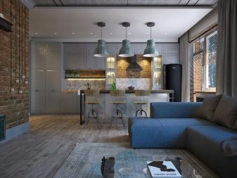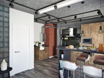 It is hard to imagine a kitchen-living room without a brick. Both carelessly processed wood and its imitation will find their place in this setting. Concrete is sometimes used, for example, when finishing a floor. (Although wood and parquet in this case is also a common option).