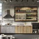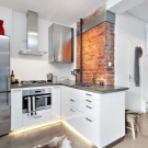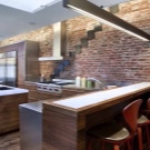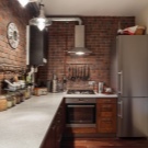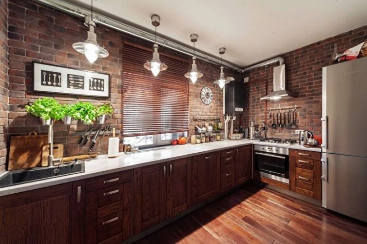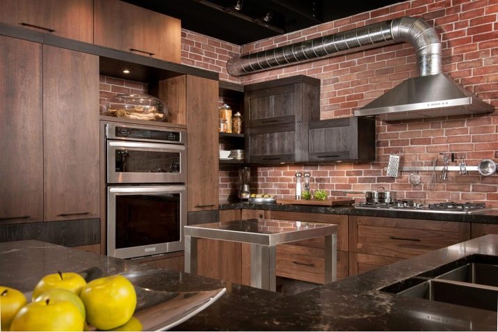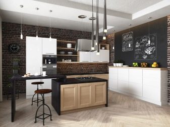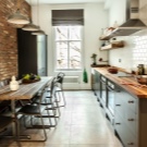 In loft-style kitchens, brick is still the most popular option. At the same time, brick walls are best placed on the sides and opposite the area where you will work with products. A for the working area, it is better to prefer something more practical, for example, wallpaper or plaster. In small kitchens, designers advise using bleached brick or making matte, rough walls of a light color.