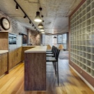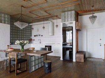 Another decoration option is glass blocks, this is a material that has not yet received much distribution, but is still used. Glass panels will be the best solution for all rooms, and they will increase the small kitchen both in breadth and in height. In addition, glass blocks fit perfectly into the industrial design.