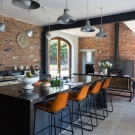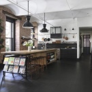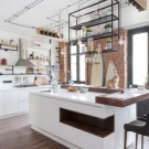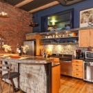 - The huge kitchen with a brick wall and a dining counter is successfully complemented by original chairs, a seating area and large windows. A variety of signs, hanging chandeliers and cast-iron pans hanging on hooks complete the impression.