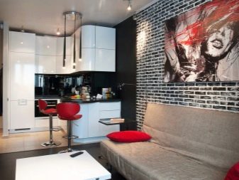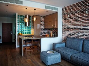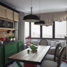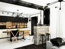 A mandatory element of the kitchen-living room is the bar. Atmospheres will give it retro elements: bar stools in the style of the 50s, sofas made of leather, a variety of vinyl records on the walls, retro posters. Refined serving table in the spirit of vintage will also help to emphasize the “retro-loft” direction.