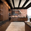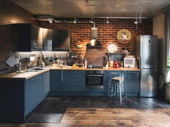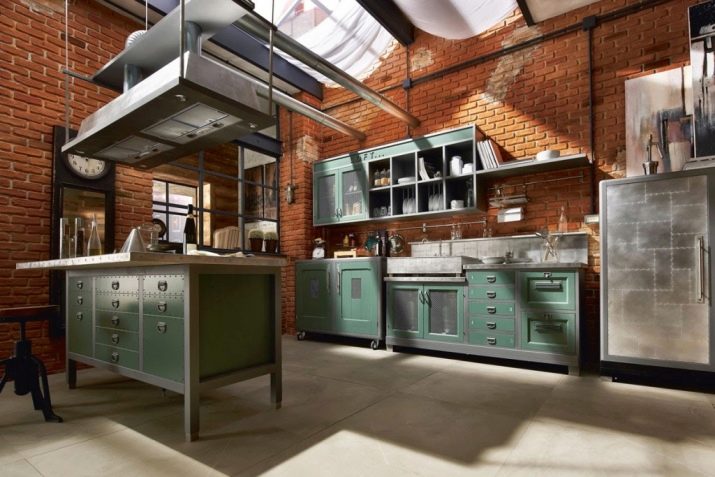 - In this kitchen, severity and restraint will be paramount. Furniture of a shade of a sea wave, brick walls and an abundance of metal create an original ensemble that fully meets the original loft.
