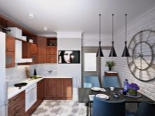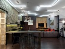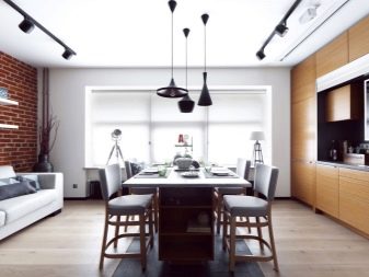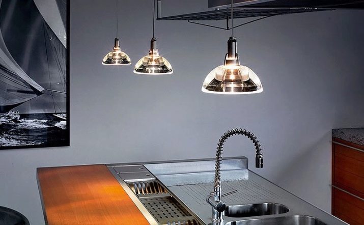 - If the kitchen is connected to the living room, then it will be advisable to take care of the presence of several lamps made of metal and glass. This will help highlight accents and further delimit the room.
