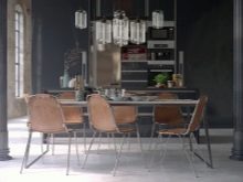 As for tables, most designers recommend glass structures. They will allow to unload the interior, refresh it, give lightness. Chairs should also be light, a prerequisite is a metal frame. However, loft style wooden tables are not uncommon. True, such models should stand on high legs.