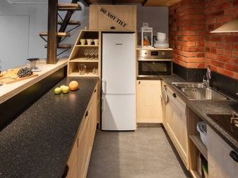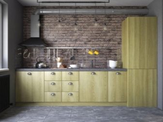 In the loft style, preference should be given to minimalistic pieces of furniture, and the materials for them can be used very different. Most often this is wood and glass. Small-sized rooms are filled exclusively with direct headsets, the upper cabinets are not applicable here. Instead, they use airy wooden shelves to increase space.