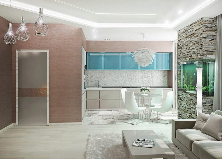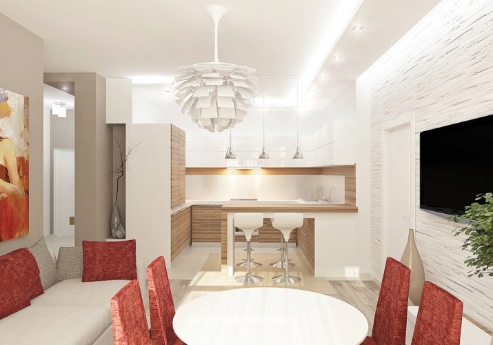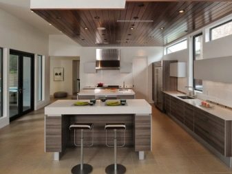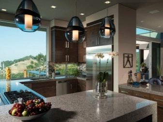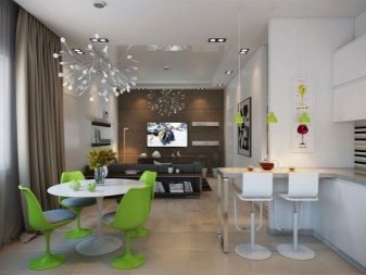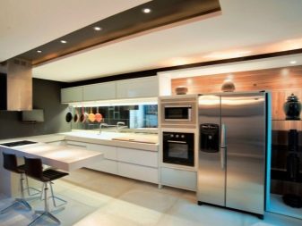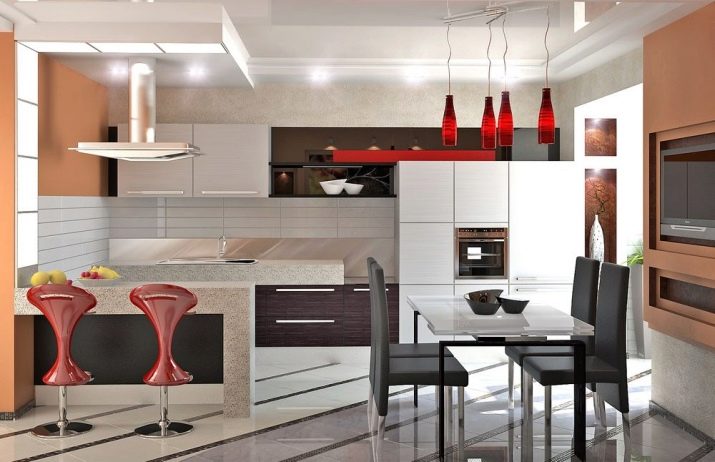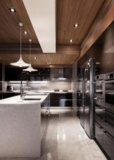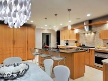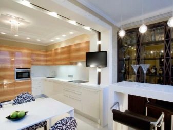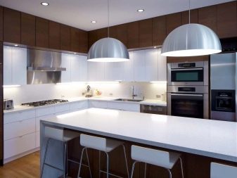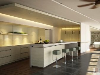 Ceiling type models can have rounded and geometric shapes. Given the methods of zoning, ceiling lighting can be separate for each functional area of the kitchen. For example, you can highlight the bar, guest space, dining area, resting place. As for a stand or a tall narrow table, it can be highlighted by a number of identical single-type lamps. This design looks stylish and impressive.