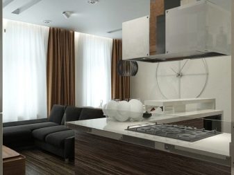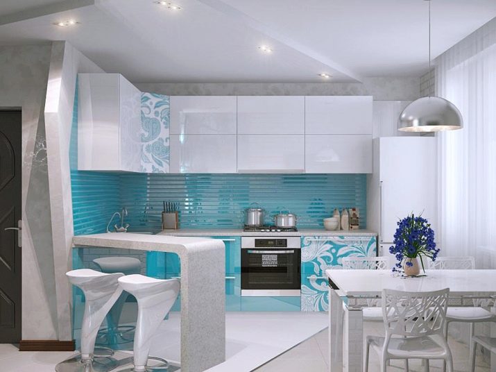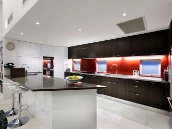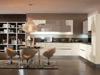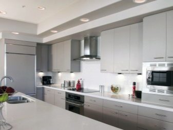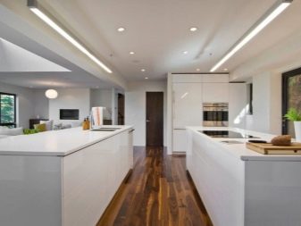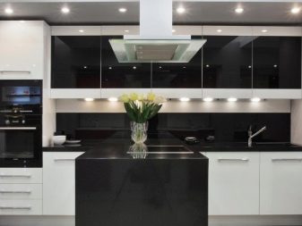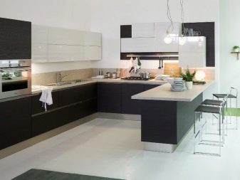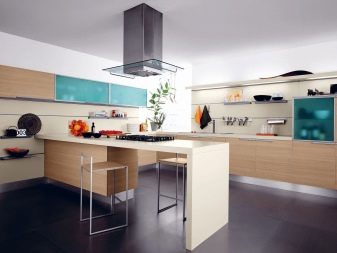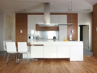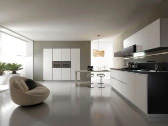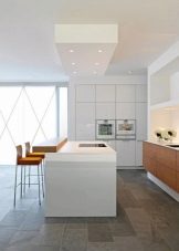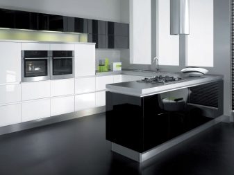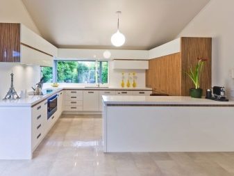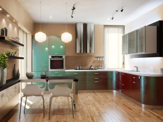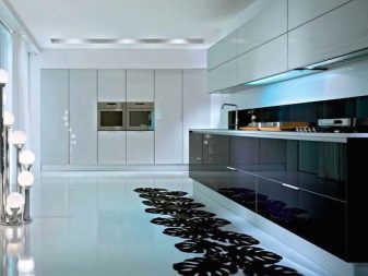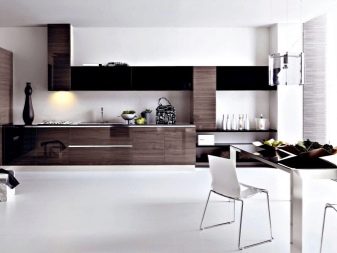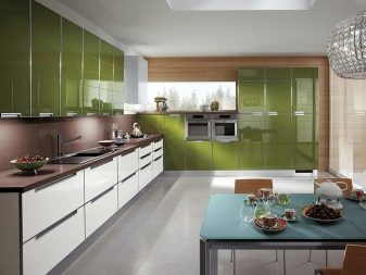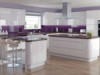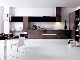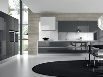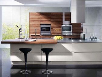 The facades of the headset should be plain and glossy, as smooth as possible. The furniture itself can be built in a straight line or combining typical cabinets with rounded modular units. Usually it is combined by a single countertop made of wood or stone. Often the facades of wall cabinets are diluted with glass inserts. This brings the illusion of lightness and visual space to the interior.