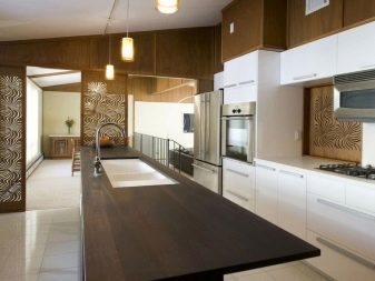 Important hso that against the background of the selected color, metallic colors are contrasted, which can be silver and gray-black. Selected tones should be in harmony with the wood. Bright touches can be embodied in inserts made of plastic or other artificial material. This can be the facades of cabinets, a headset, appliances, chairs, lampshades, decorative elements (for example, a picture or a vase with vibrant greenery).