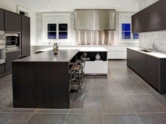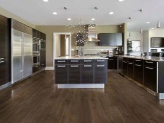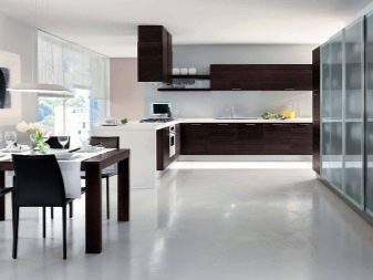 The bulk floor has no seams and looks very impressive in the interior. Usually it is characterized by a sufficient level of gloss, resistant to moisture, chemicals, is able to simulate the texture of any material, up to stone, quartz and slate. If desired, with the help of this material, it is possible to equip in the kitchen not the entire floor, but only some part, making it a stylish accent of the interior. The color is selected based on the color scheme taken as the basis for the design of a particular kitchen.