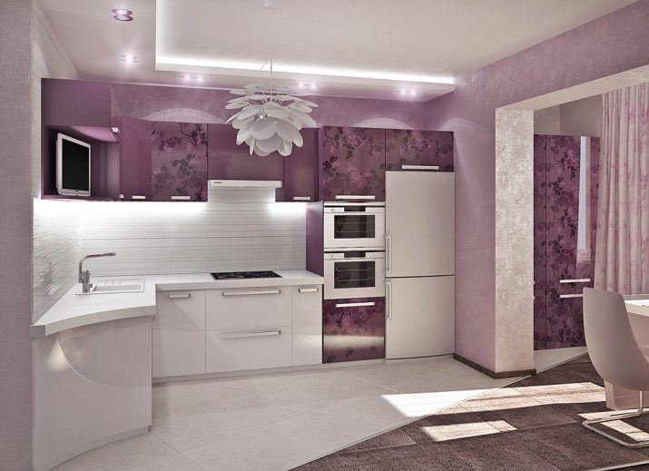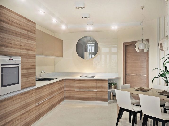 It is worth noting that often in the design of Art Nouveau film and drywall are combined. This allows you to give uniqueness to the interior, more rational to consider the location of ceiling lights. When designing, you can mix matte and glossy textures, due to which the ceiling design looks interesting and without a picture. As for design, it can be one-, two- and three-level. Typically, the larger the kitchen, the greater the number of levels.