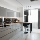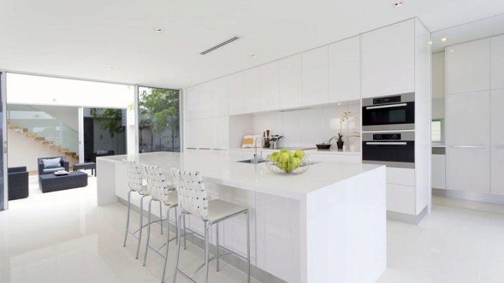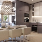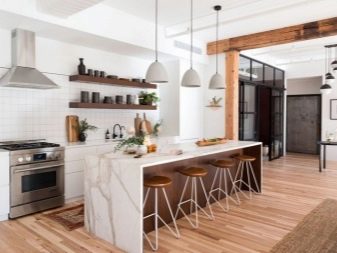 - Bright island kitchen-living room - A great example for those who need to equip a spacious room and zoning the room. The island here serves as a physical partition, separating one space from another: the kitchen and living room are different in style, although they have common features. Unusual lamps, white paintings and transparent vases serve as an excellent modern decor - they are unobtrusive, but noticeable, and make the room very cozy, despite the cold color scheme.