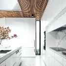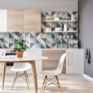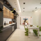 - If you like green design, but you want to live in a modern interior, wood can easily be combined with plastic and acrylic stone. The facades with an unusual minimalist design are finished in wood and look great, they are also supported by other elements of wood in the interior. White glossy textures are also used here - in furniture and on the facades of cabinets. They reflect light and make space airy.