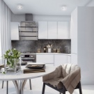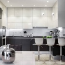 - A very small kitchen can be stylishly finished in the aesthetics of minimalism. Glossy facades to the ceiling, stylish lighting and a monochrome solution make the interior simple, stylish and truly modern, as well as visually expand it. Minimalism is also very convenient in a small area.You will not stumble or bump into anything. The design looks quite lively and individual thanks to the decorative zone on the wall with dark paintings and small paintings.