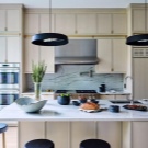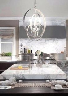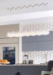 In a large kitchen, it is worth considering options for the location of many lamps around the perimeter of the room or over the entire area of the ceiling - this is especially easy to implement with hinged and suspended ceiling structures. Two lighting options can be made - bright and twilight, suitable for atmospheric dinners. Sometimes one chandelier is enough, but it should have many lamps to create uniform lighting.