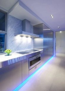 Light is a good way of zoning. In modern kitchens, cases of combining a kitchen with a living room are not uncommon. In this case, the zones are easily divided using two light sources. They can be different in their brightness, intensity or hue.