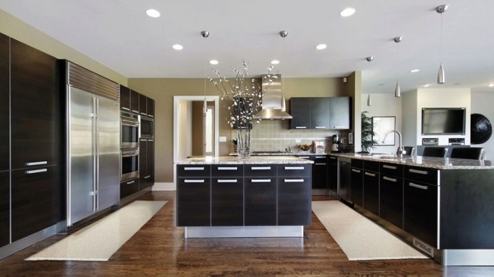 Olive shades and warm shades of gray look good. Lighting will play a very important role in the dark interior of the kitchen - it should be bright enough for comfortable work in the kitchen and emphasize important places in the interior.