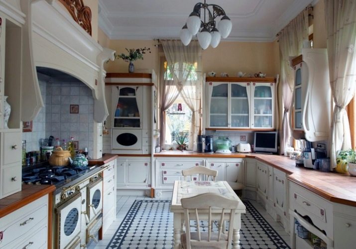 Provence is a beautiful style that creates the atmosphere of a French village. Here, simple, light furniture can be supplemented with a beige wooden tabletop, an apron of square tiles. You can revive the atmosphere with light curtains with floral prints, fabric tablecloths, textile rugs. Some cabinets can be replaced with open shelves, which will make the interior more airy.