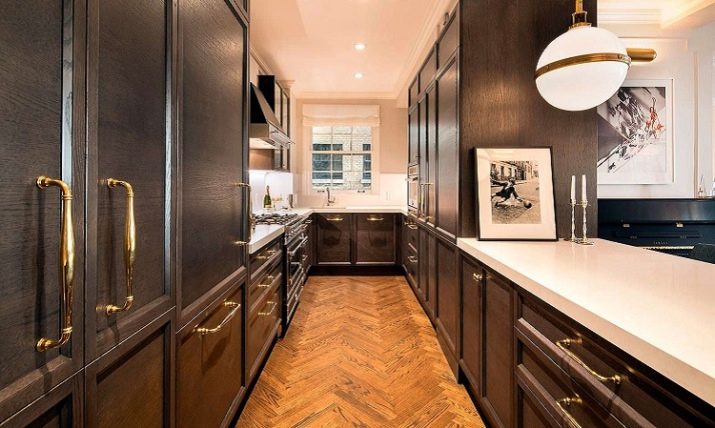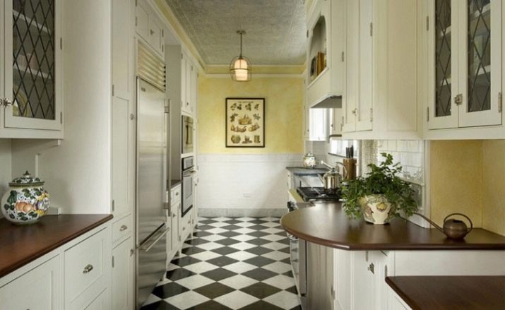 A win-win option is a plain floor. At the same time, it is desirable that it does not coincide with the shade of the lower cabinets (be lighter or darker at least a couple of tones), otherwise everything will merge into an incomprehensible spot. Drawings on the floor in a narrow space, as a rule, only emphasize this drawback. The exception is contrasting diagonal squares (“checkerboard”), stripes located across long walls, and small dark squares on a light background.