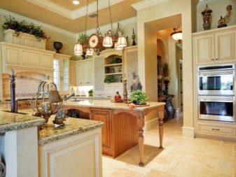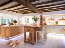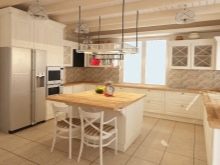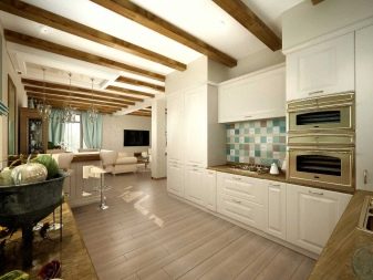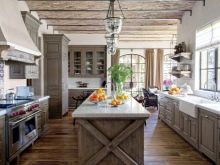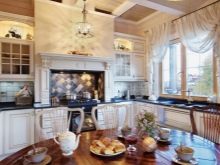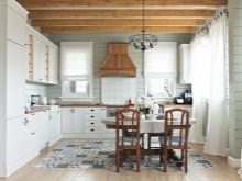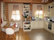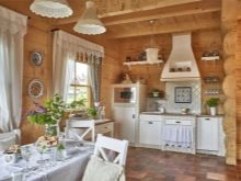 The kitchen in the house is equipped with maximum comfort. There will certainly be open cabinets with deep shelves, carved wooden furniture painted in white, blue, lavender, beige or pale green. Wood is also used as decoration for walls and ceilings - lining painted in white, massive beams of ceilings stand out on the ceiling, they are darkened for contrast, making in one tone with the floor.