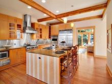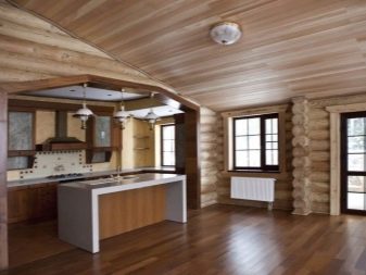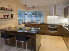 As a rule, in a wooden house, the kitchen has a small area or turns out to be part of the combined space with a dining room and a guest area. All these points should definitely be considered when choosing interior design and furniture. The kitchen in a small room does not have to be massive. Corner or U-shaped options with alignment of surfaces along the wall with a window are well suited. Bright spacious kitchen allows you to free the walls, focusing on the island.